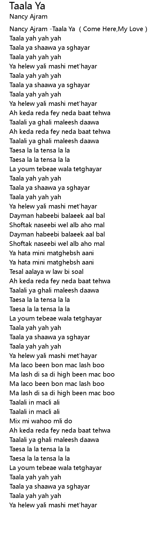 | [00:00.46] | Nancy Ajram Taala Ya Come Here, My Love |