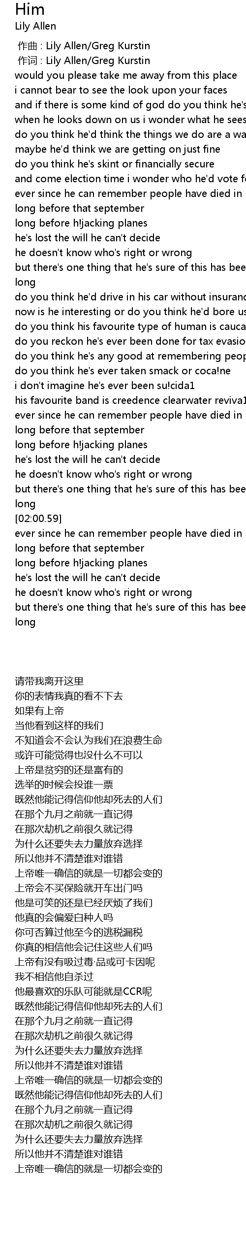 | [00:00.00] | 作曲 : Lily Allen/Greg Kurstin |