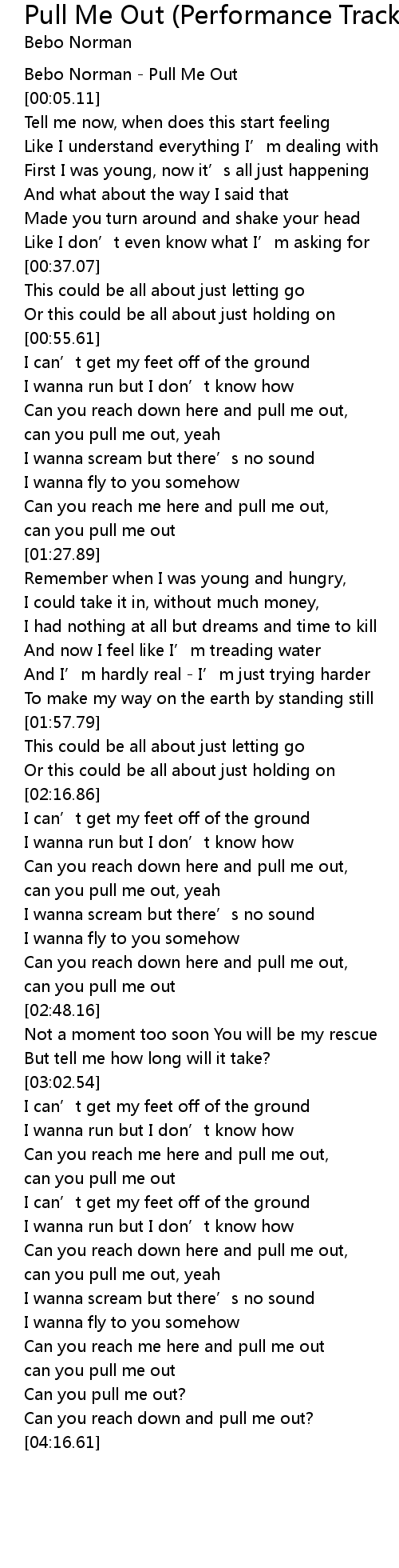 | [00:01.38] | Bebo Norman - Pull Me Out |