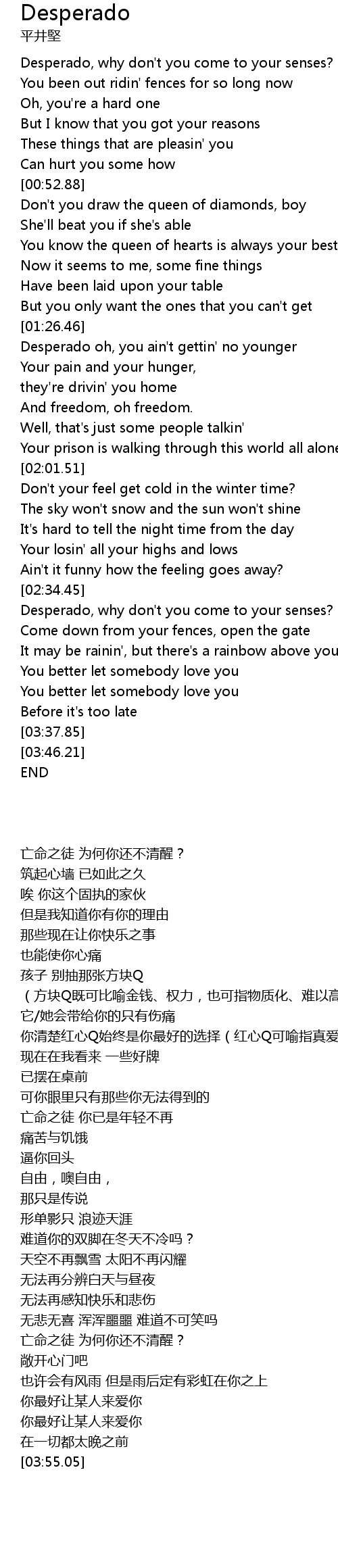 | [02:34.97] | Desperado, why don't you come to your senses? |