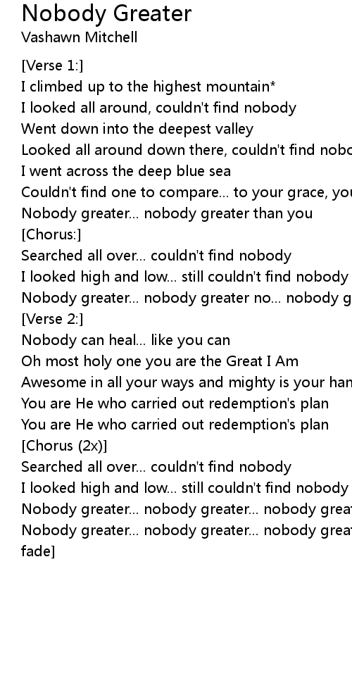 Nobody greater... nobody greater... nobody greater than you [repeat, adlib and fade] |