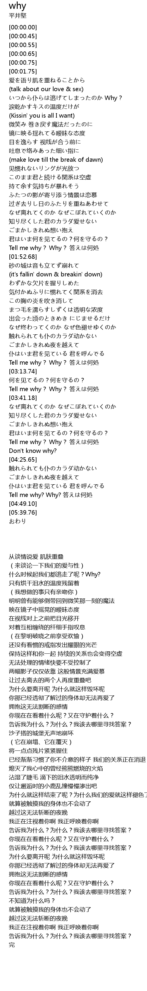 | [04:42.81] | Tell me why? Why? 答えは何処 |