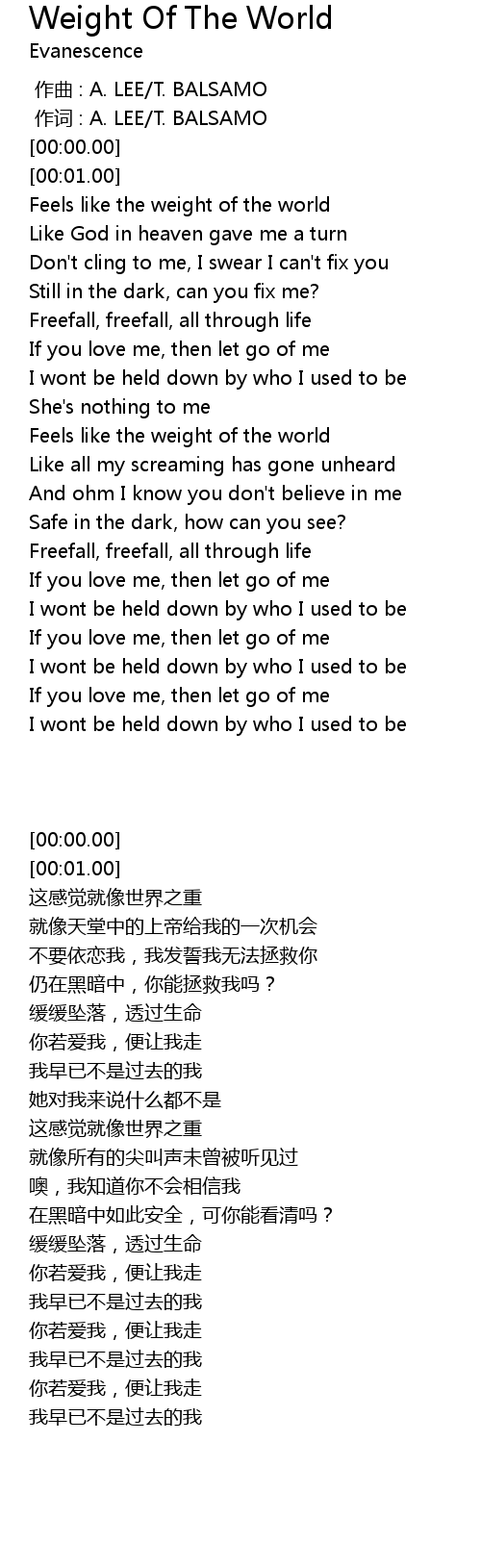 | [00:18.44] | Feels like the weight of the world |