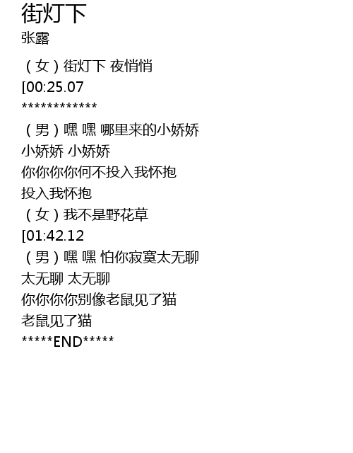 | [00:15.08] | (女)街灯下 夜悄悄 |