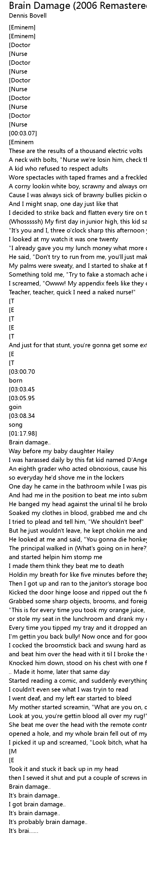 | [03:10.76][03:00.70][01:19.13][01:09.19] | Brain damage, ever since the day I was born |