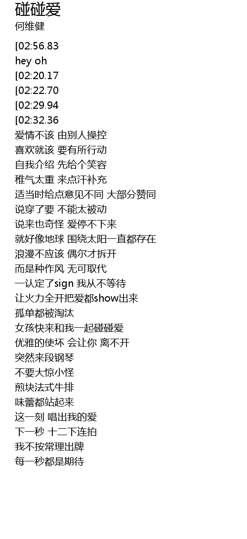 | [03:06.16][02:56.83][02:26.94][02:17.71][01:28.68][01:18.60][00:30.21][00:20.21] | 和我碰碰爱 hey oh |