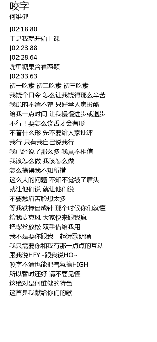 | [02:42.97][02:23.88][01:33.51][00:33.50] | 咬的字清不清 我不晓得 |