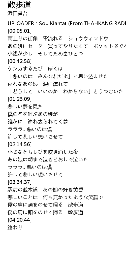 | [03:56.36] | 僕の肩に頭をのせて帰る 散歩道 |