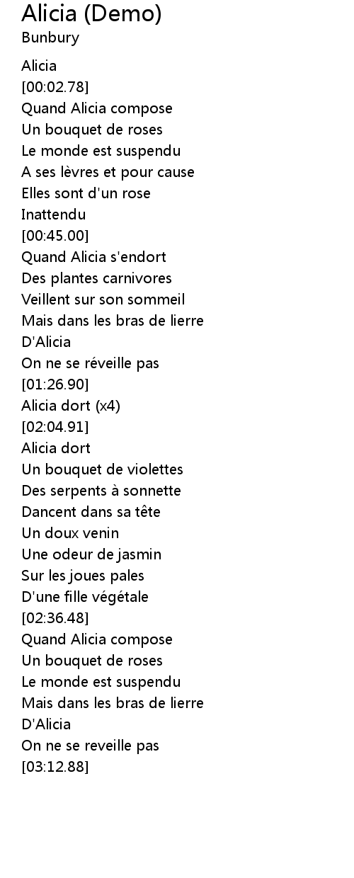 | [00:59.12] | Quand Alicia s' endort |
