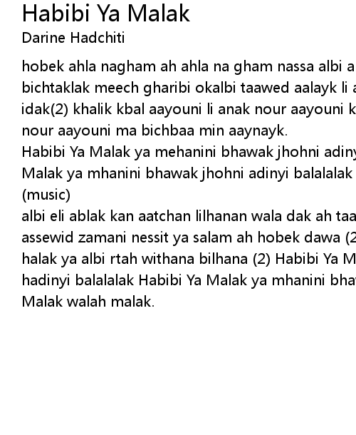 albi eli ablak kan aatchan lilhanan wala dak ah taami el hawa lama ya o3mri ijib assewid zamani nessit ya salam ah hobek dawa (2)biyikfini yali rah min o3mri ana halak ya albi rtah withana bilhana (2) Habibi Ya Malak ya mehanini bhawak chou hadinyi balalalak Habibi Ya Malak ya mhanini bhawak chou hadinyi balak Habibi Ya Malak walah malak. |