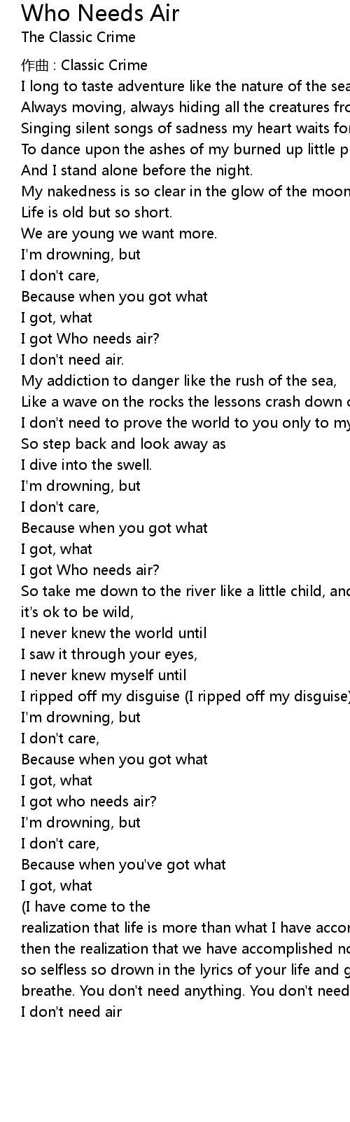 | I got You don't need air. (x2) [in the background](I have come to the realization that life is more than what I have accomplished. And life is more then the realization that we have accomplished nothing at all. True success is so selfless so drown in the lyrics of your life and give up the air that you breathe. You don't need anything. You don't need anything) | |