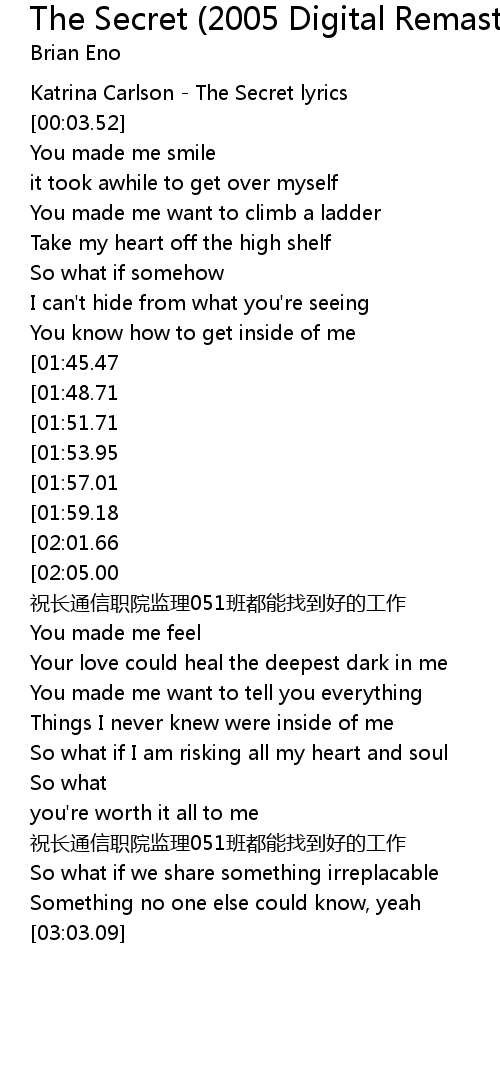 | [00:01.11] | Katrina Carlson - The Secret lyrics |