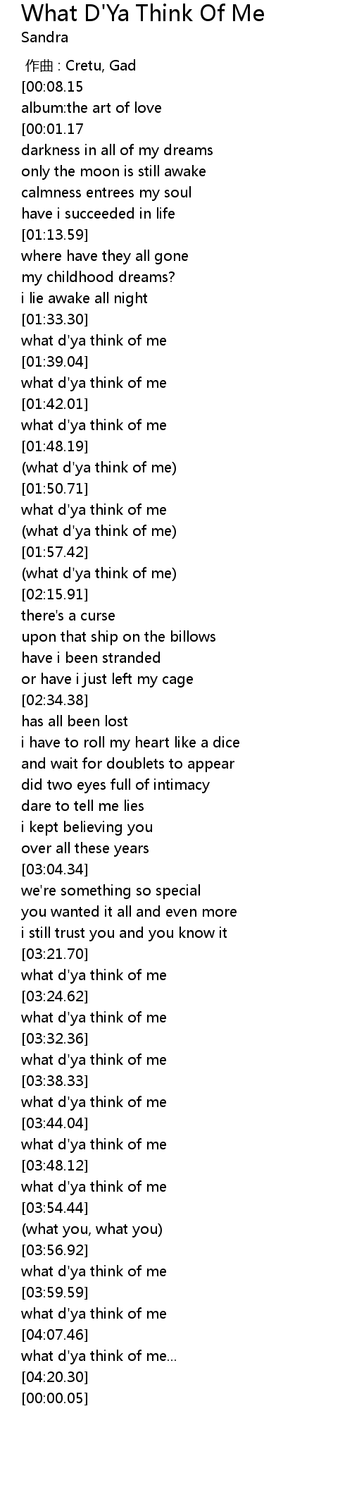 | [04:21.87][00:08.15] | sandrawhat d' ya think of me |