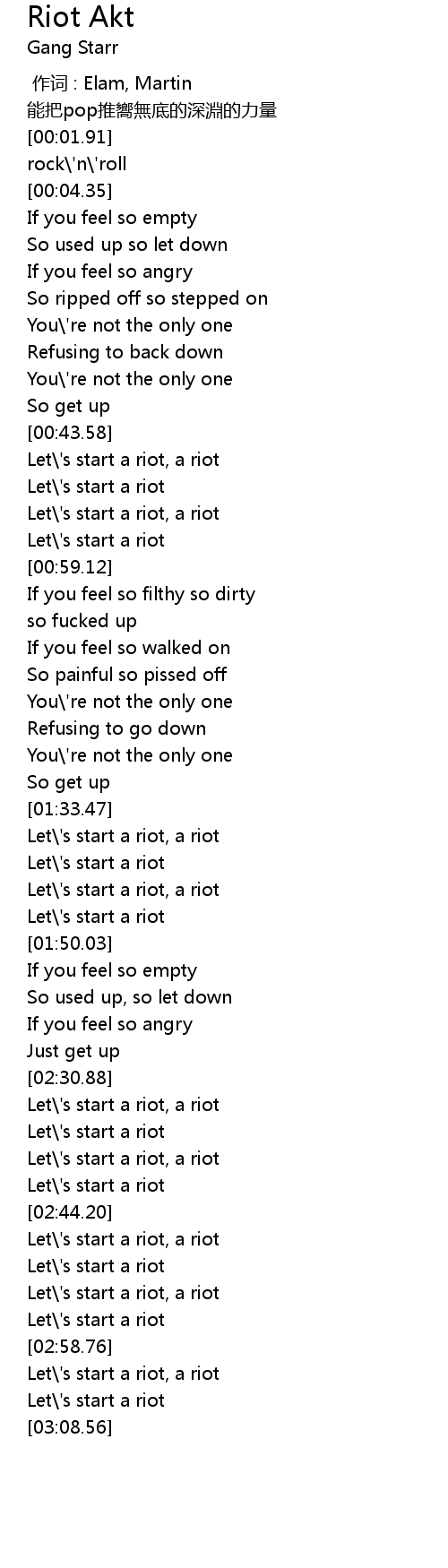 | [03:03.39] | Let\'s start a riot |