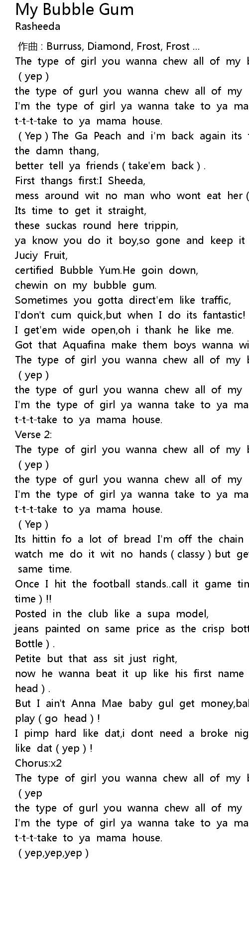 | [01:03.179] | the type of gurl you wanna chew all of my bubble gum. |
