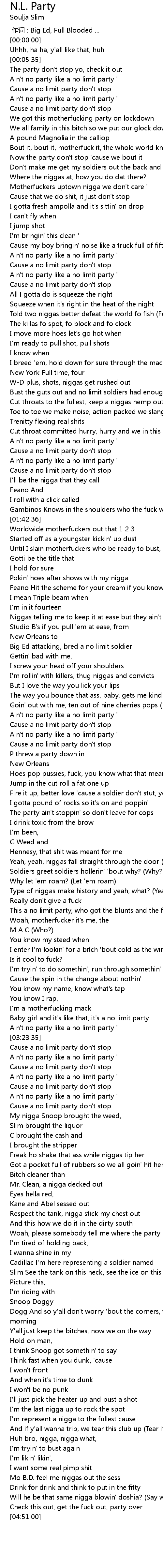 | [02:24.72] | Ain't no party like a no limit party ' |