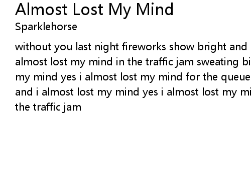 | without you last night fireworks show bright and i almost lost my mind yes i almost lost my mind in the traffic jam sweating big for cans and i almost lost my mind yes i almost lost my mind for the queue last night fireworks show bright and i almost lost my mind yes i almost lost my mind for the queue last night in the traffic jam |