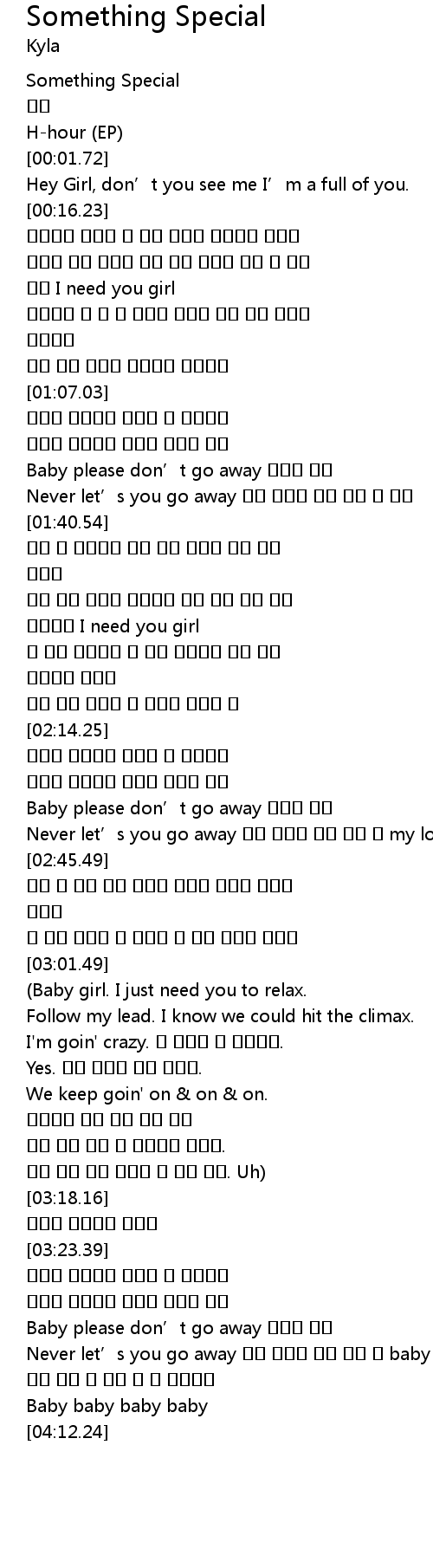 | [01:25.44] | Baby please don’t go away 가지고 싶어 |