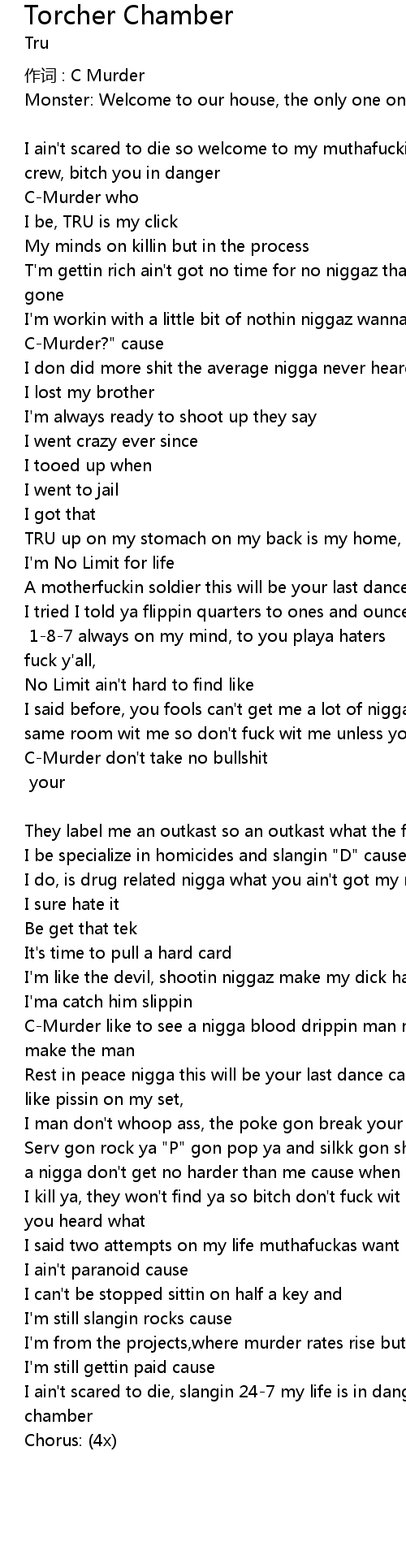 | Chorus: I ain't scared to die so welcome to my chamber kill em all [Boom] your life is in danger (4x) [C-Murder] | |