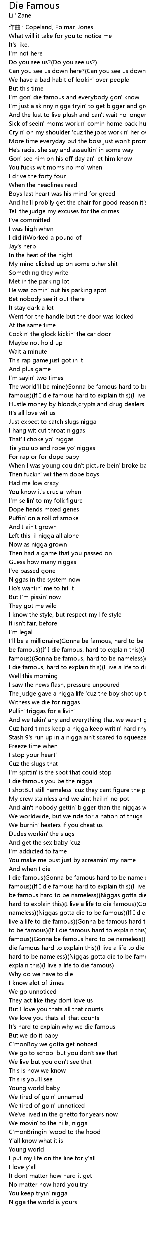 | The world' ll be mine Gonna be famous hard to be nameless Niggas gotta die to be famous If I die famous hard to explain this I live a life to die famous | |