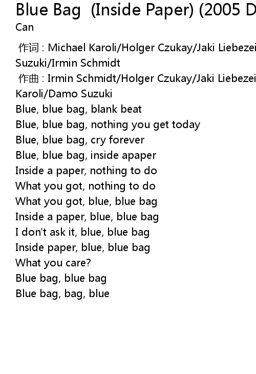 | [01:06.648] | Blue bag, bag, blue |