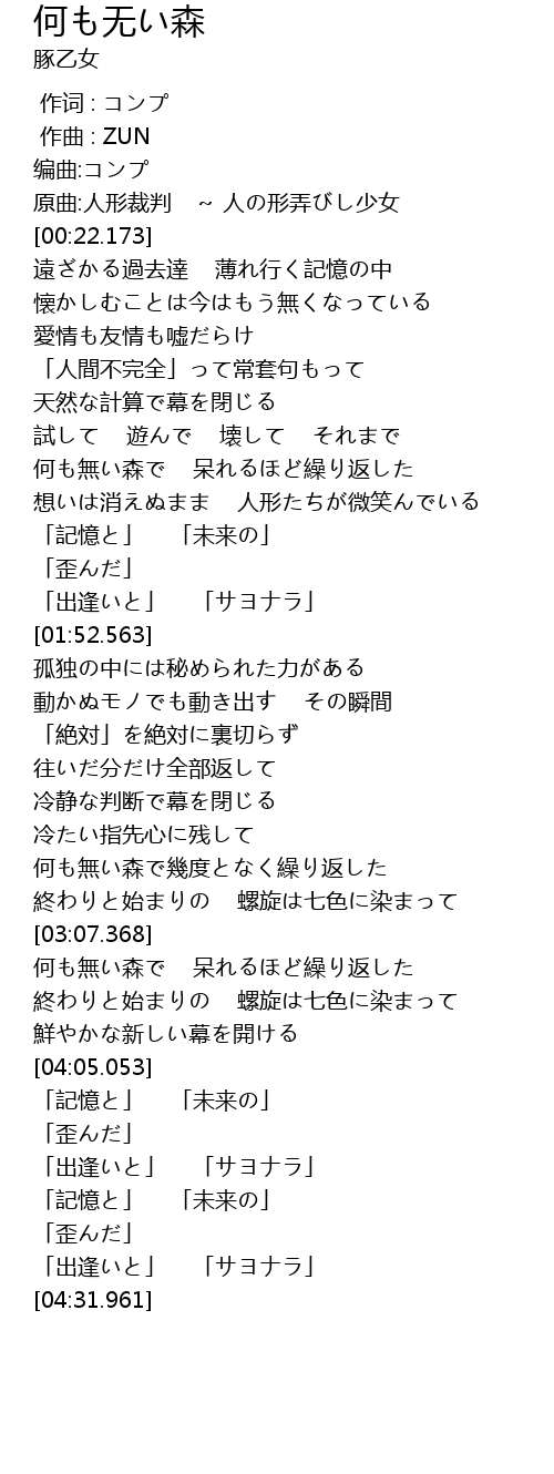 | [03:32.104] | 何も無い森で 呆れるほど繰り返した |