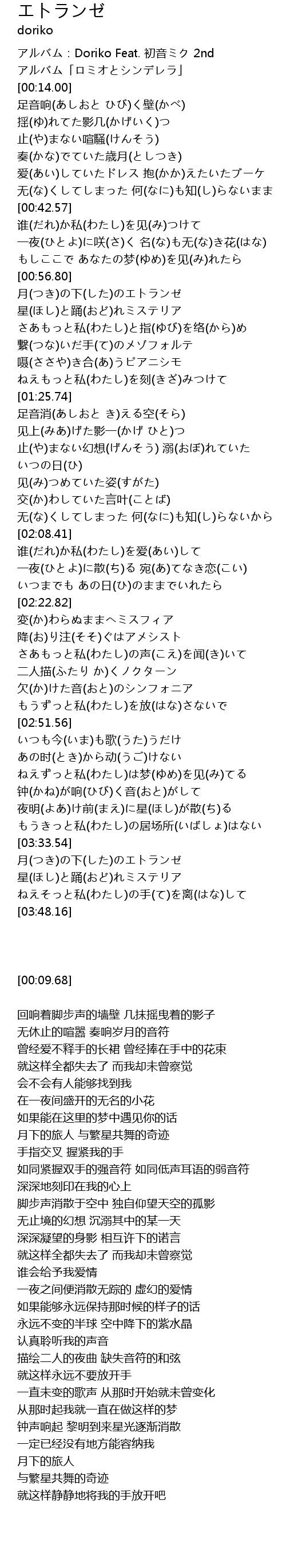 | [00:09.68] | アルバム:Doriko Feat. 初音ミク 2nd アルバム「ロミオとシンデレラ」 |