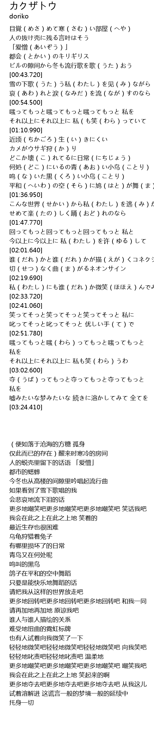 | [01:29.660] | 鸣(な)いた黒(くろ)い小鸟(ことり) |