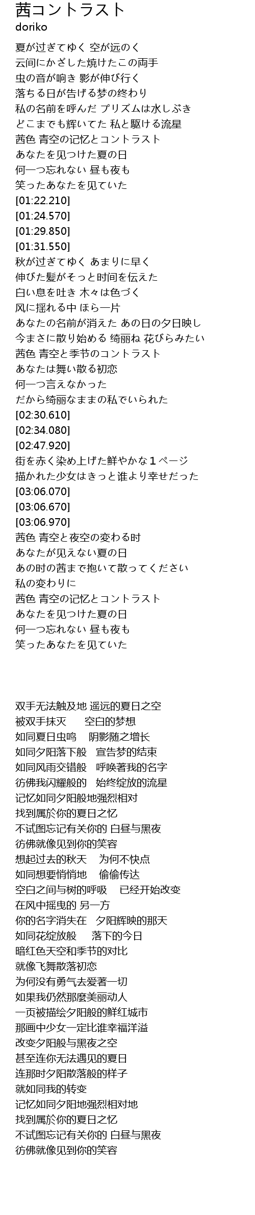 | [03:32.300] | 茜色 青空の记忆とコントラスト |