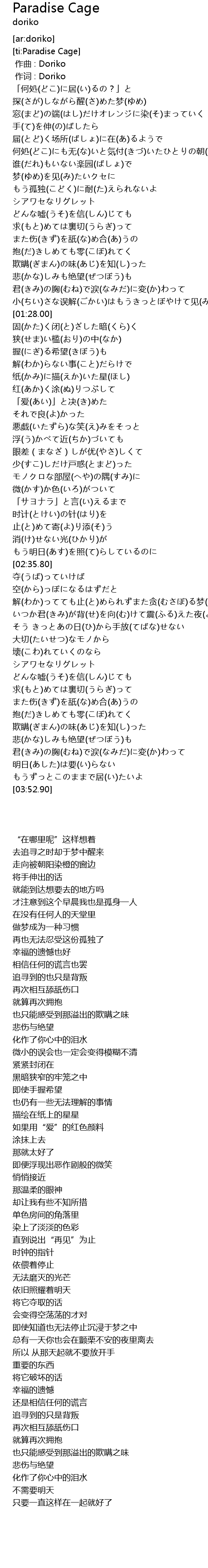| [01:42.28] | 狭(せま)い槛(おり)の中(なか) |