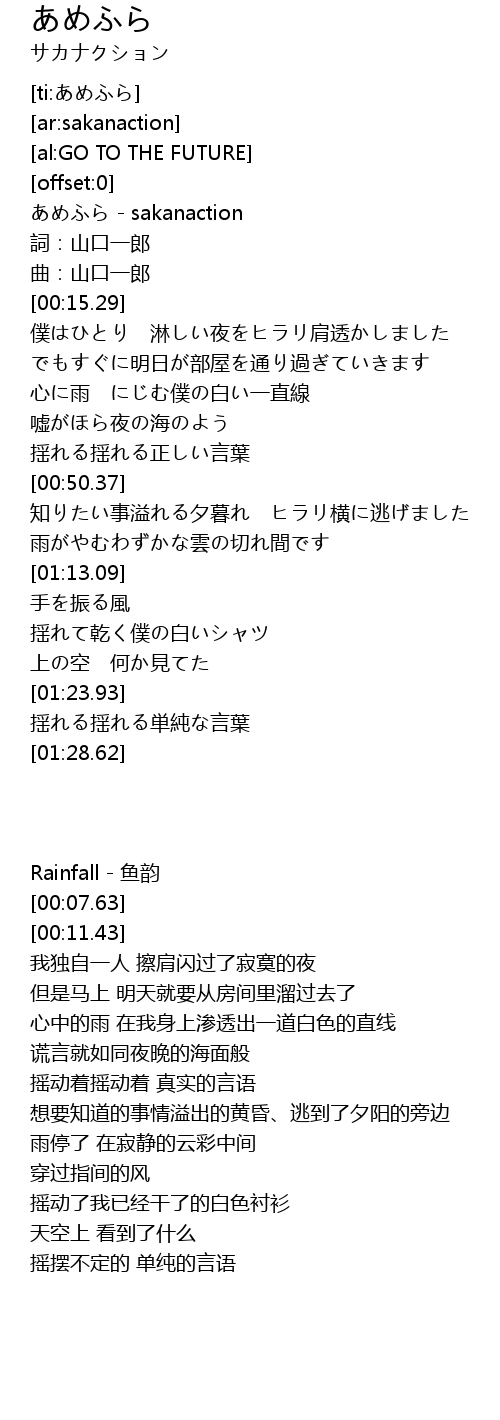 | [00:00.95] | あめふら - sakanaction |