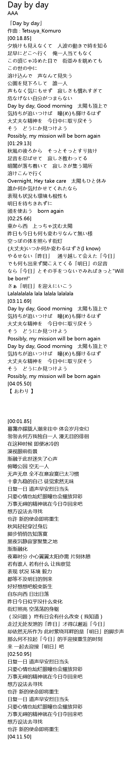 | [03:39.08] | Day by day, Good morning 太陽も頂上で |