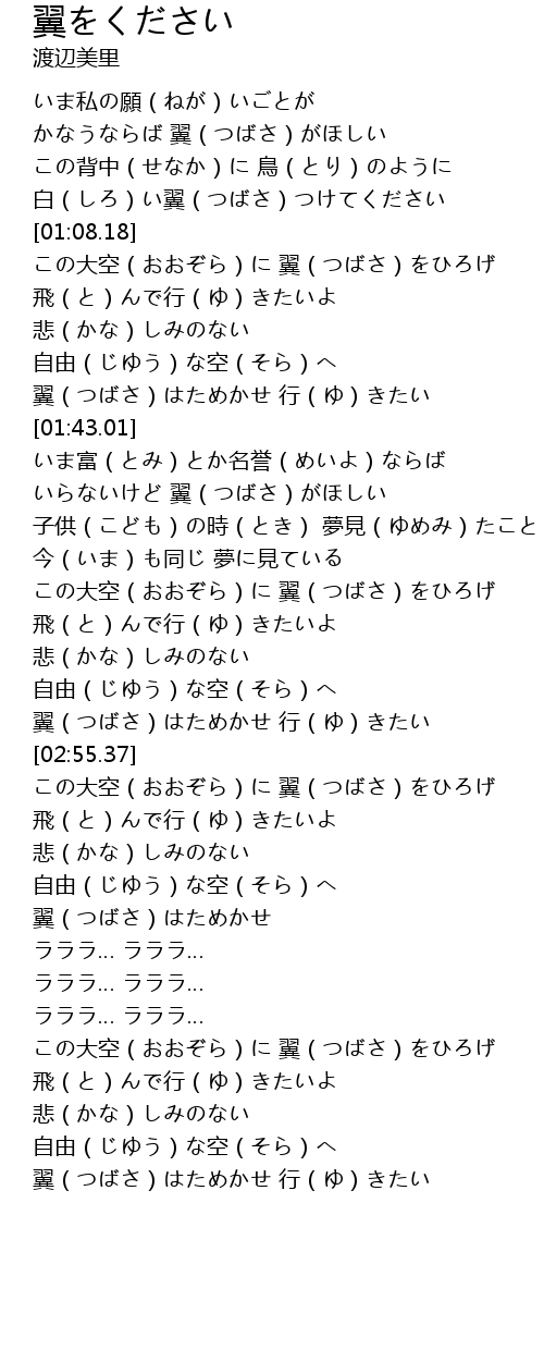 | [00:28.57] | かなうならば 翼(つばさ)がほしい |