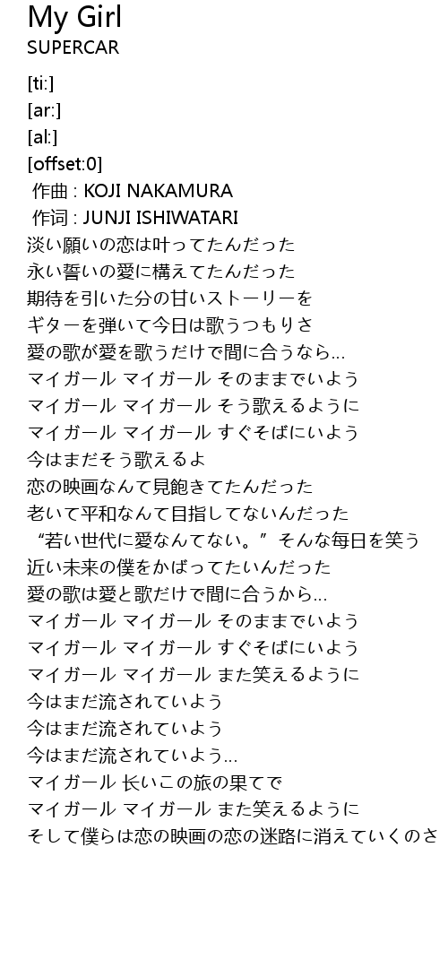 | [01:13.65] | マイガール マイガール そのままでいよう |