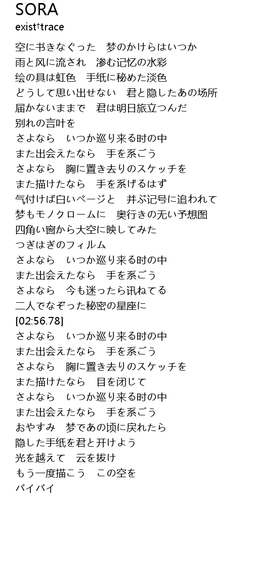 | [00:06.58] | 空に书きなぐった 梦のかけらはいつか |