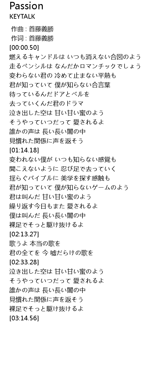 | [00:17.82] | 燃えるキャンドルは いつも消えない合図のよう |