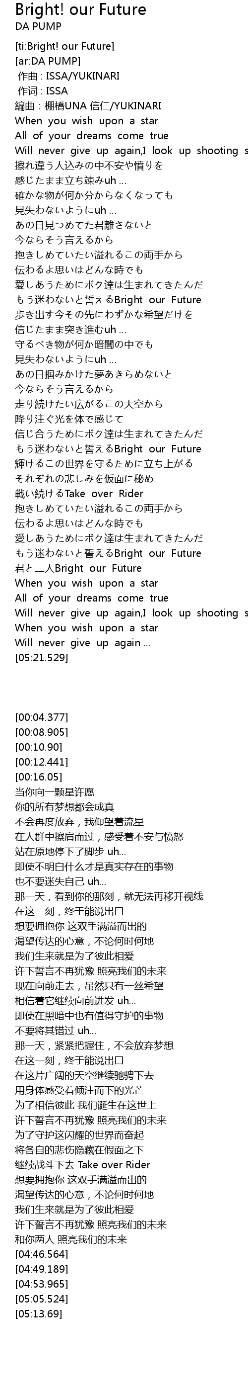| [04:29.35] | もう迷わないと誓えるBright our Future |