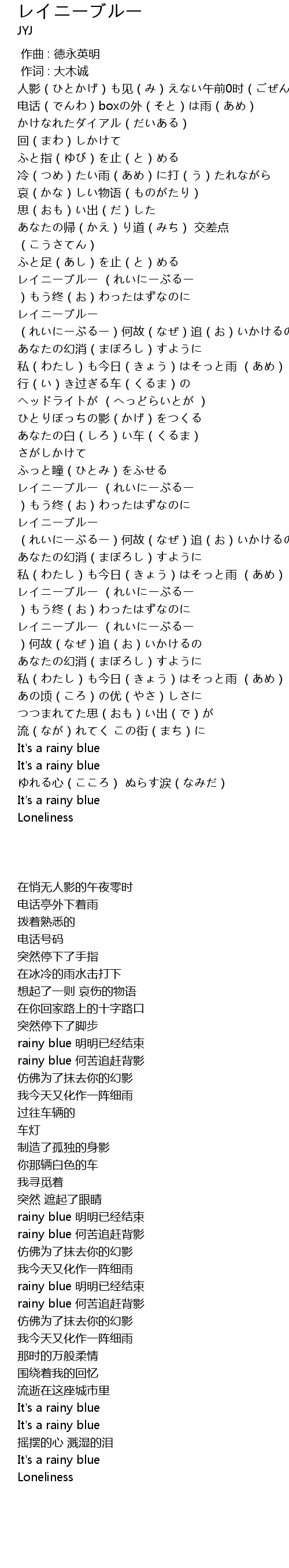 | [03:08.68] | レイニーブルー (れいにーぶるー )もう终(お)わったはずなのに |