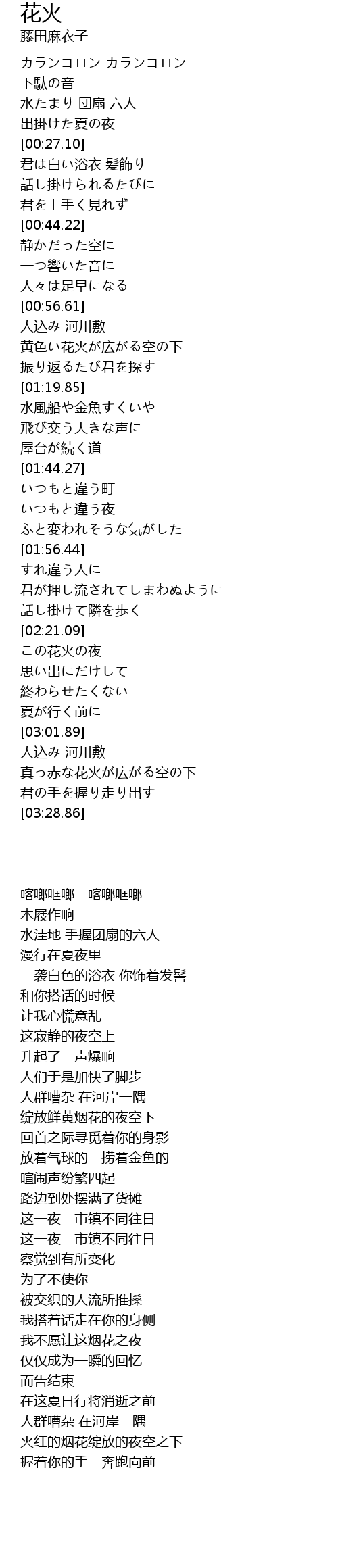 | [03:11.33] | 真っ赤な花火が広がる空の下 |