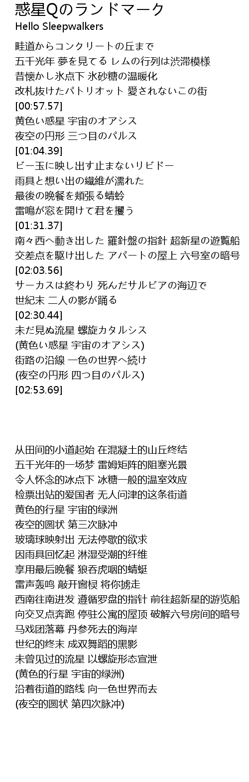 | [00:36.78] | 五千光年 夢を見てる レムの行列は渋滞模様 |