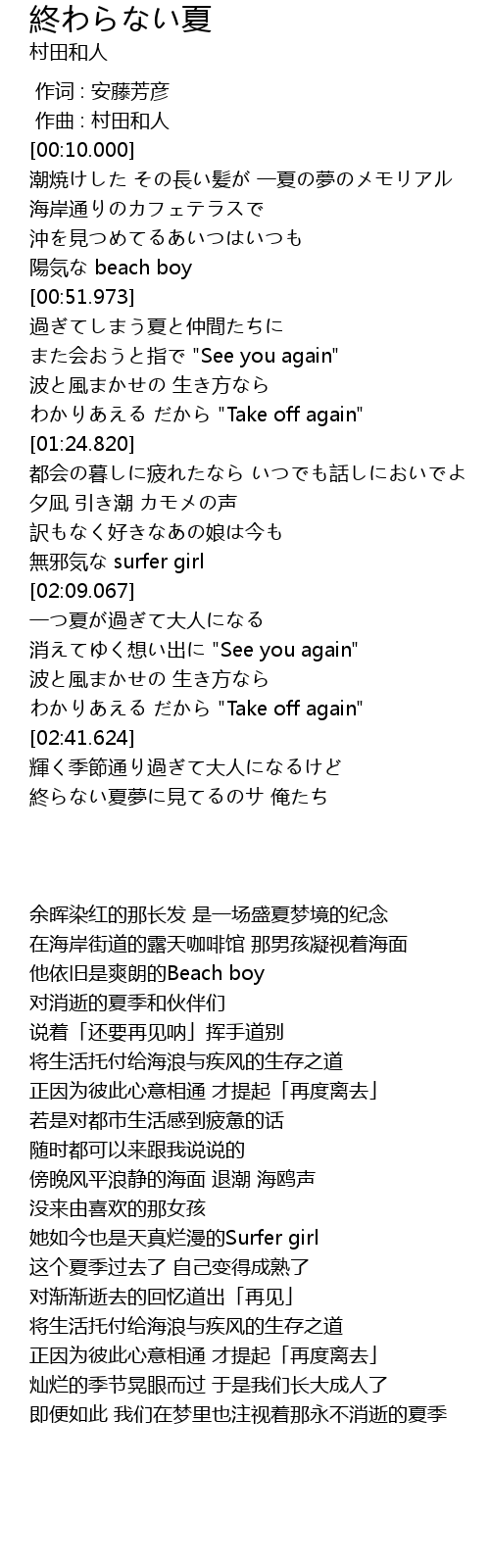 | [03:15.386] | 終らない夏夢に見てるのサ 俺たち |