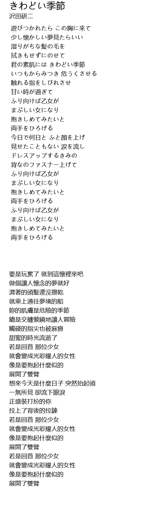 | [00:49.884] | 君の素肌には きわどい季節 |