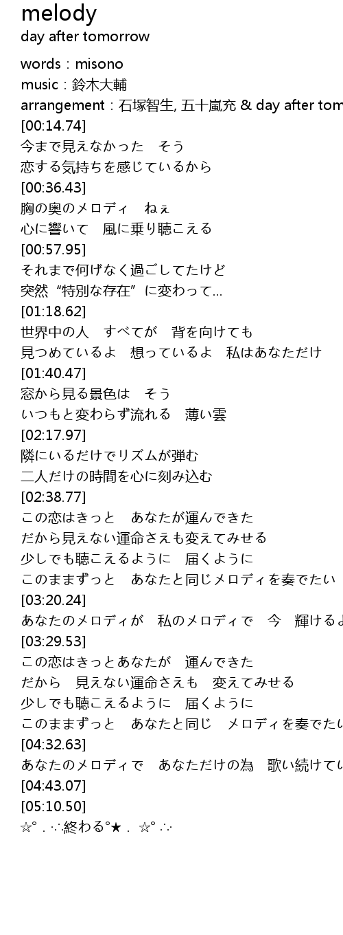| [03:20.61] | あなたのメロディが 私のメロディで 今 輝けるように |