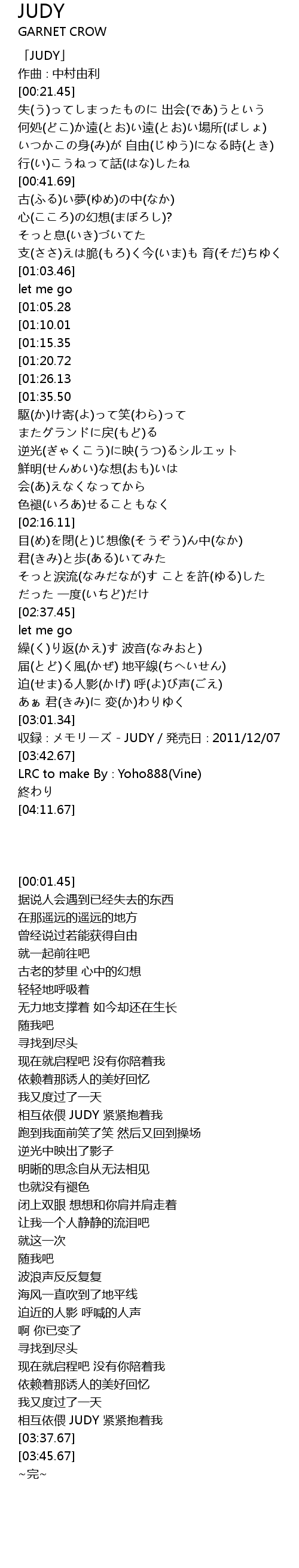 | [03:37.67] | 収録∶メモリーズ - JUDY/発売日∶2011/12/07 |