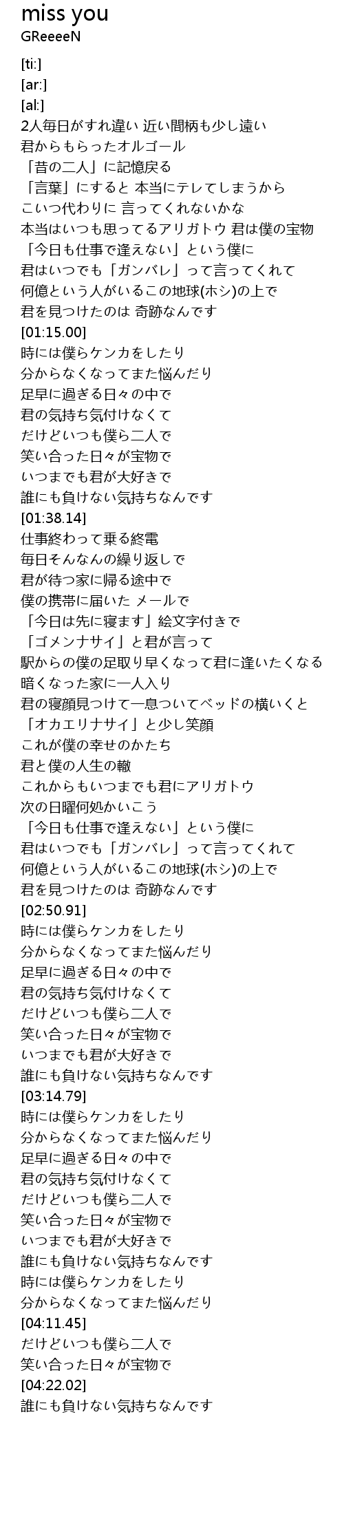 | [02:24.22] | これからもいつまでも君にアリガトウ |