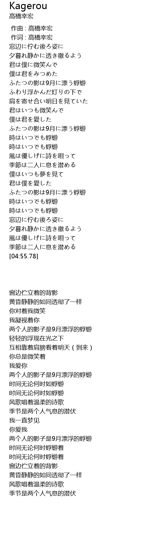| [03:19.53] | ふたつの影は9月に漂う蜉蝣 |