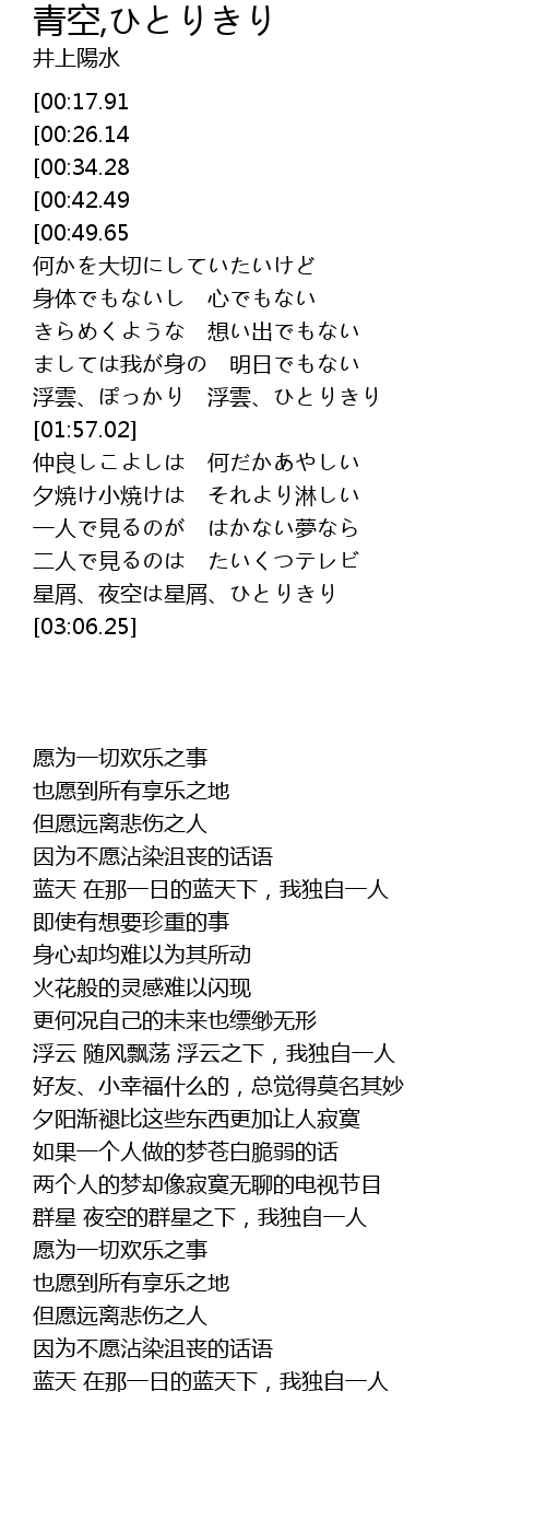 | [03:47.27][00:49.65] | 青空、あの日の青空、ひとりきり |