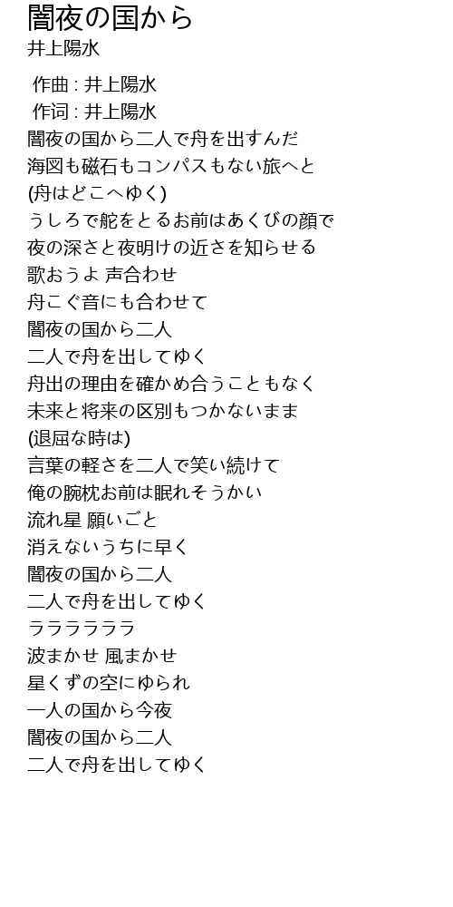 | [00:09.03] | 闇夜の国から二人で舟を出すんだ |