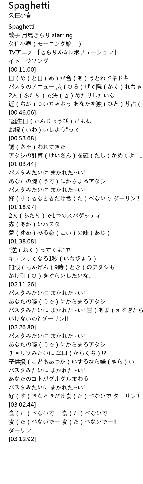 | [02:54.38] | パスタみたいに まかれた~い! 好(す)きなときだけ食(た)べないで ダーリン!! |