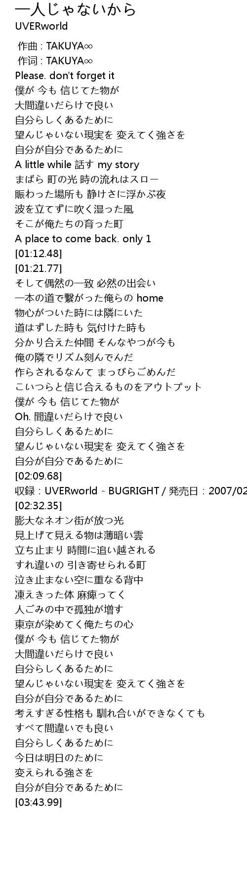 | [02:12.68] | 収録:UVERworld - BUGRIGHT/発売日:2007/02/21 |